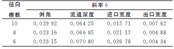 在盡量減小數(shù)值誤差影響的前提下,為比較各參數(shù)對流量的影響程度,采用最小二乘法對各曲線進行線性擬合,得到各擬合曲線的斜率b值,見表2。通過比較斜率b值的大小,就可得出各參數(shù)在其變化范圍內對流動的影響程度。由表2可知,在各參數(shù)的變化范圍內,流道深度對流量的影響最大,進口寬度和倒角次之,出口寬度最小。