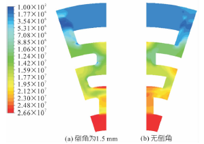 圖2 1.5mm倒角和無倒角時的靜壓云圖(單位:Pa)