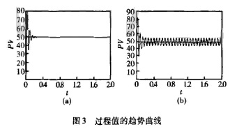 理想情況下,控制閥的摩擦引起的非線性是忽略的,其過程的趨勢曲線如圖3(a)所示。采用圖1所示的反饋控制,控制器使用常規的線性PID控制,調節閥為氣動調節閥,使用數據驅動模型來模擬實際的控制閥,數據驅動模型的參數設置為:S=5,J=2。其中S表示死區加粘連,J表示滯跳。通過仿真來得到PV和OP的時間序列,為分析控制閥的非線性提供數據。由于控制閥的模型是非線性的,導致整個控制系統是非線性的,而采用的控制器是線性的,這種非線性導致過程出現震蕩(15),其過程值的趨勢曲線如圖3(b)所示。