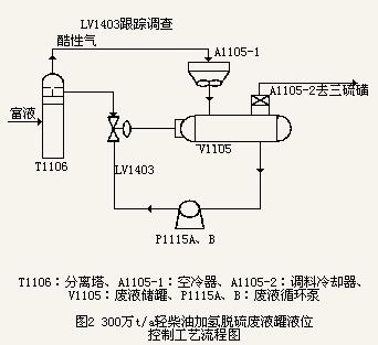 新型陶瓷內件調節閥于2001年11月在某煉油廠300萬t/a輕柴油加氫脫硫廢液罐液位控制系統中應用(圖2),系統正常運行至今,表明新型閥門經受住該處流體的強腐蝕作用,確保了生產的正常安全運行,并節約了大量維修更新閥門的費用。