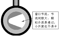 | 介質流經節流口時,在同樣的節流面積條件下,如果節流間隙小,不干凈介質不易通過, 容易堵塞;反之,則不易堵塞。對柱塞型閥芯(見圖六),它的節流面積分布在圓周上, 其節流間隙大概等于面積除以圓周長;再看窗口型閥芯(見圖七),其面積分布在窗口上 而不是在整個圓周上,所以其間隙大,顆粒很容易通過。由此可見,節流面積越集中(不是圓周分布),節流間隙越大,防堵性能就越好。這樣的典型產品有“V”型球閥、全功能超輕型調節閥等。尤其在小開度工作時,前者的節流間隙更小,更易堵卡;后者集中在“V”形口的尖端部份,面積集中,充分顯示了“V”形節流的防堵優勢。 | ||||||