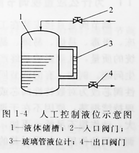 圖1-4所示是人工控制液位示意圖。液體連續(xù)不斷地通過入口閥門2流入儲槽1,同時(shí)又不斷地通過出口閥門4流出。可以看出,槽內(nèi)液位將隨著流入量或流出量而波動,波動嚴(yán)重時(shí),槽內(nèi)流體可能溢出或抽空。要解決這個(gè)問題,使液位保持在某一范圍內(nèi),最簡單的辦法是安裝一個(gè)玻璃管液位計(jì)3。以液位計(jì)的上、下限刻度線為標(biāo)準(zhǔn),當(dāng)液位上升到接近上限刻度時(shí),可以開大出品閥門的開度,或關(guān)小進(jìn)口閥門的開度;當(dāng)液位下降到接近下限刻度時(shí),可以關(guān)小出口中閥門或開大進(jìn)口閥門的開度,這樣就避免了儲槽因液位過高而溢流,或因液位下降而抽空的事故發(fā)生,使液位保持在某一范圍內(nèi)。這個(gè)過程是由人直接控制的,所以叫人工控制。